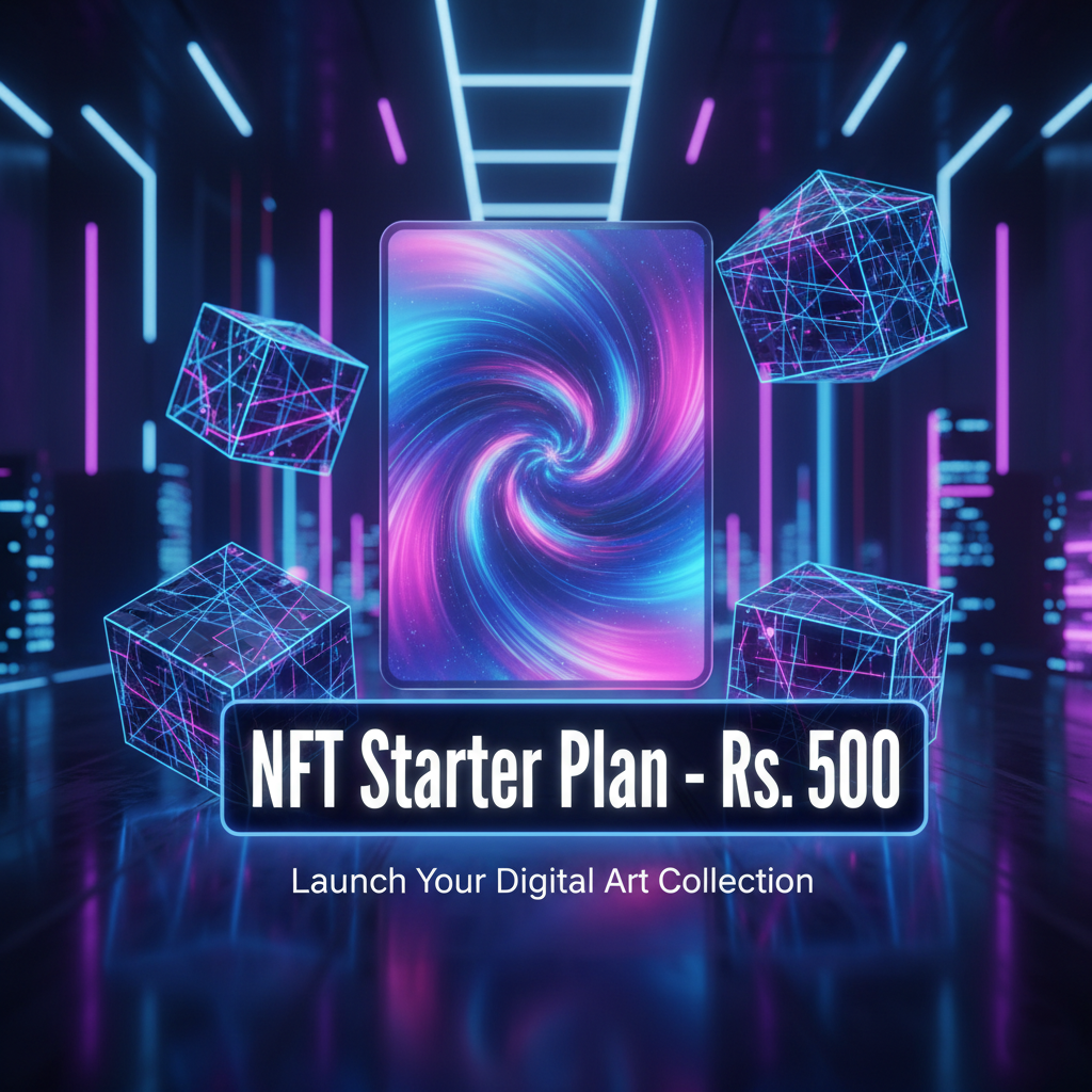 Our Starter NFT Plan (Rs. 500) is the perfect entry-level package for creators who want to step into the NFT world without complications. We will create your collection, list your NFT on the Dinevo Marketplace, set up your pricing, and provide basic wallet support — so you can focus on your creativity while we handle the technical side.